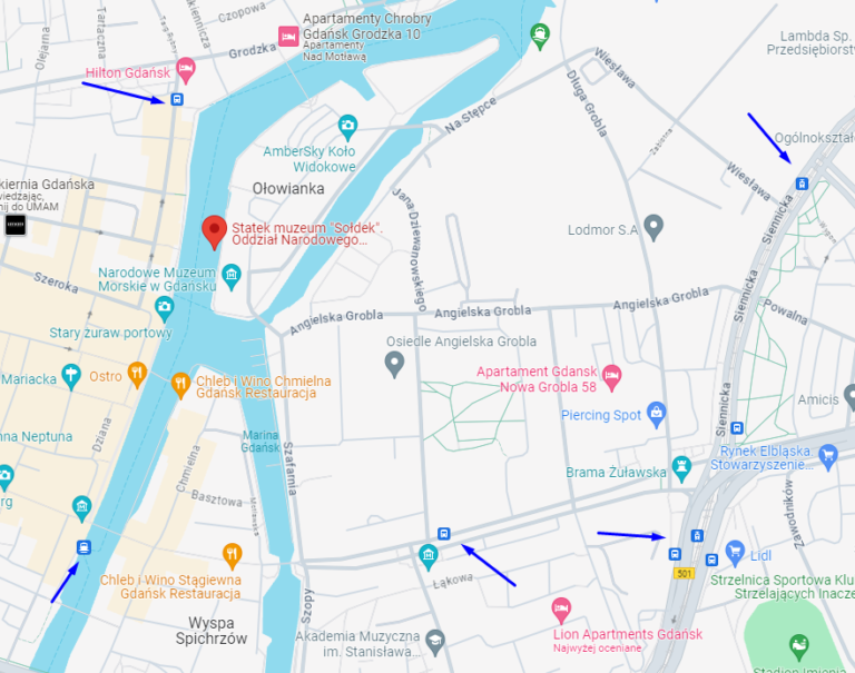 The Sołdek museum ship does not have its own parking lot, it is located on the river, so it is best to get there on foot or by public transport to avoid parking problems in the city center. You can also use nearby parking spaces according to the paid parking zone in Gdańsk.
